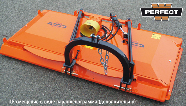 Наши косилки серии LF (кроме LF-140) оснащены простой функцией смещения стандартной комплектации. Смещение в виде параллелограмма (с ручной или гидравлической регулировкой) доступно как дополнительная опция.